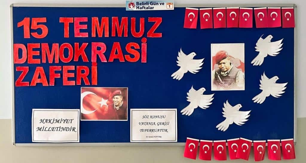 15 Temmuz 2016 günü darbe girişimiyle karşı karşıya kalan Türkiye, milleti ve devletiyle omuz omuza verdiği direniş ve mücadeleyle tüm dünyaya örnek teşkil etmiştir. Türk demokrasisini hedef alan bu hain girişim, Türk halkının demokrasiyi ve seçilmiş iradeyi korumak için gösterdiği destansı direnişle geri püskürtülmüştür. İşte bu şanlı günün anma gününde öğrencilerimiz tören düzenleyip şiir, yazı ve oratoryo ile etkinliklerini sundular.